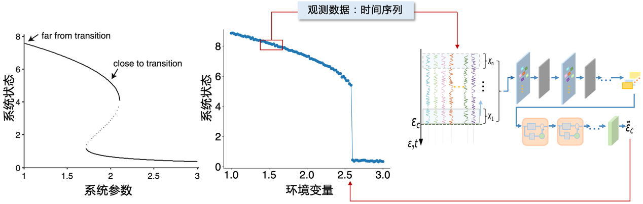实际复杂系统涉及大量要素之间的动态非线性相互作用,一个重要特征是系统参数或外部环境的渐变可能导致系统状态发生突变,即相变临界现象(图1)。这种突变可能带来灾难性后果,例如系统性金融风险、大面积停电、生态系统崩溃等。因此,在系统发生突变之前对临界点进行定量预测至关重要。为此,不同学科的学者进行了长期探索,提出了多种早期预警信号(early warning signals),例如滞后自关联和方差的上升、空间涨落的上升、基于统计物理学的临界慢化指标等。然而,预警信号仅能暗示突变发生的概率趋势,而无法对临界点位置和发生时间进行提前预测。